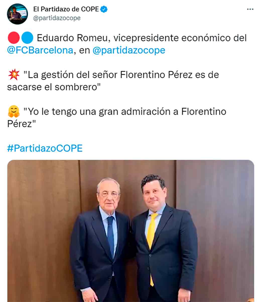 No acaba aquí la cosa, porque en las últimas horas han surgido declaraciones sumamente mosqueantes del vicepresidente culé Eduard Romeu. “La gestión de Florentino Pérez es para sacarse el sombrero. A nivel empresarial nadie va a descubrirle. Es posible que puedan fichar a Haaland y Mbappé porque el Real Madrid es un gran club y tiene un potencial y una fortaleza muy grande. Si hubiéramos hecho los deberes estaríamos en la misma situación. Siempre he admirado mucho a Florentino Pérez”.