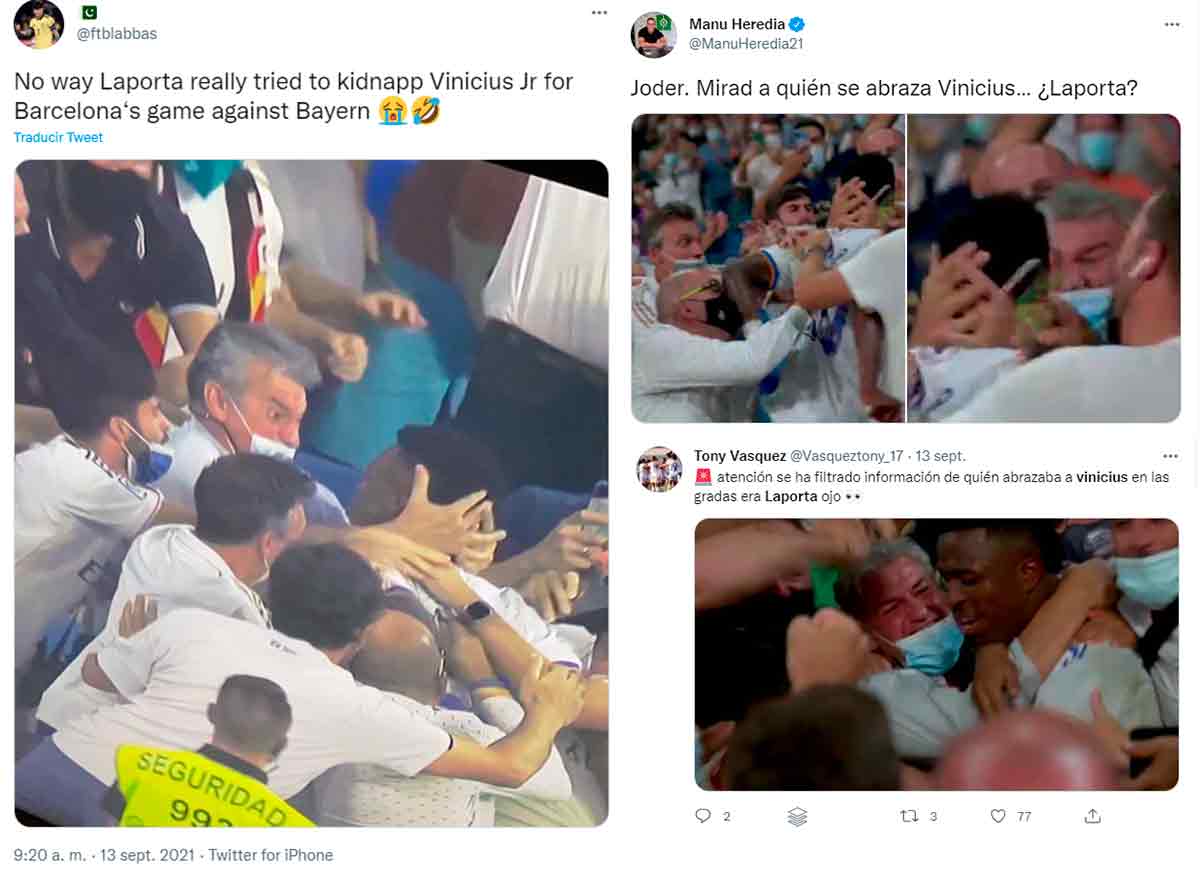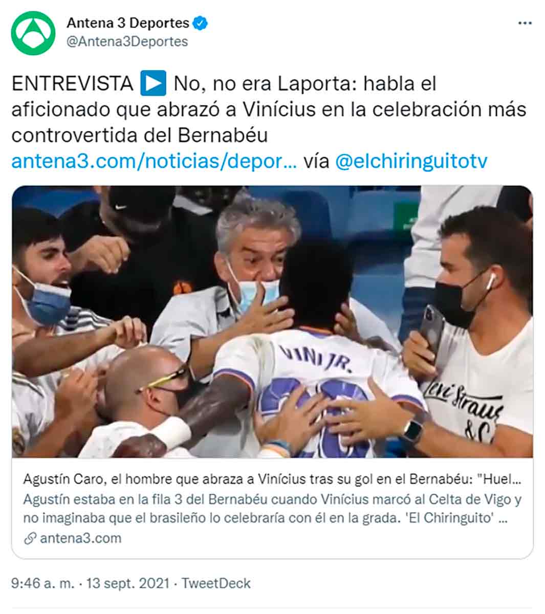El algodón no engaña y El Chiringuito tampoco (?). Apenas unos días después de esa portada, jugó el Madrid ante el Celta y Vinícius, como es sabido, estropeó el novísimo césped blanco dejando un profundo surco con el salpiquinho. Arrebatado tras lograr un gol espectacular, el brasileño trepó hasta la grada para abrazarse a los aficionados, escena que sirvió al programa de Pedrerol para sacudirnos con una revelación: entre los espectadores que estrujaron a Vini podría haberse encontrado, camuflado en su mascarilla antiCovid, el mismísimo Jan Laporta.