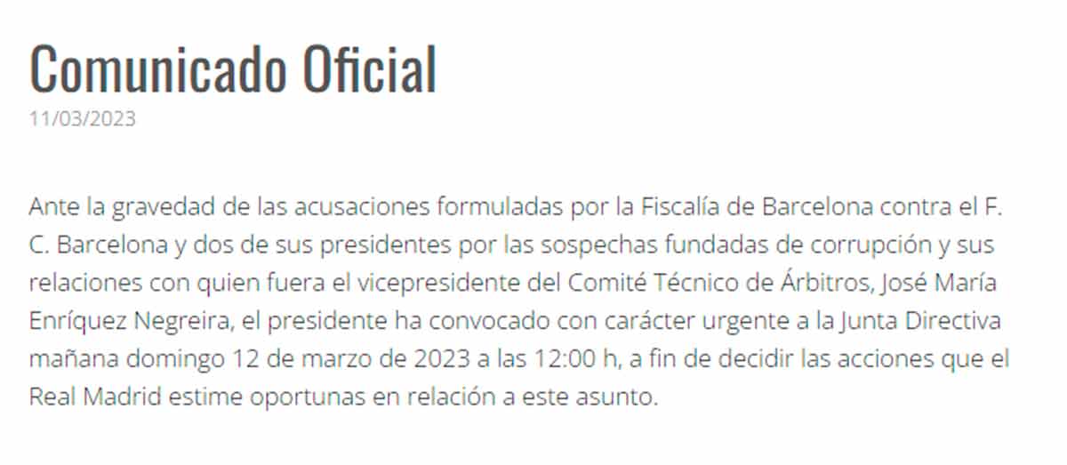 “La Junta Directiva del Real Madrid C. F., en su reunión celebrada en el día de hoy, ha tomado conocimiento de las graves acusaciones formuladas por la Fiscalía de Barcelona contra el F. C. Barcelona, dos de sus presidentes, Josep María Bartomeu y Sandro Rosell, y los exdirectivos Albert Soler y Óscar Grau, sobre la base de potenciales delitos, entre otros, de corrupción en el ámbito deportivo, en el marco de las relaciones entabladas por dicho club con quien fuera vicepresidente del Comité Técnico de Árbitros, José María Enríquez Negreira.