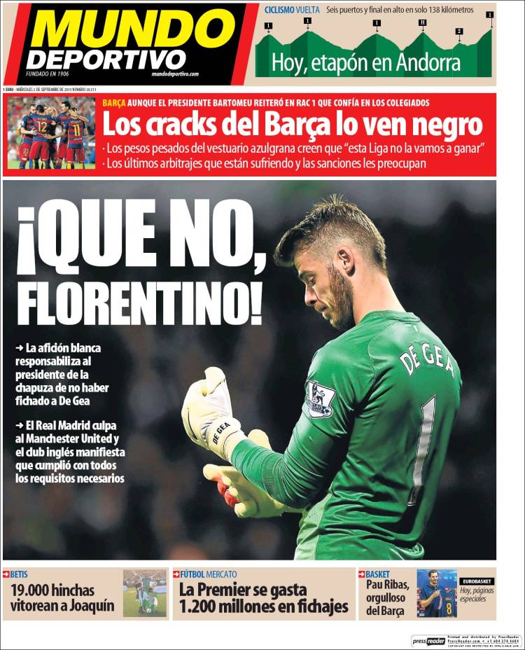 Y sobre todo, ¿con qué cara vienes aquí a contarnos (parte superior) que los jugadores de tu equipo están inquietos por los arbitrajes cuando tu club ha sido manifiestamente favorecido por los árbitros a lo largo de (cuanto menos) los últimos ocho años? Enhorabuena: has tardado un cuarto de hora más que Simeone en decir que la Liga está ya ganada por el Real Madrid. Simeone lo dijo desde lo alto de unas chanclas cuando faltaban dos meses para el comienzo de la temporada y tú has esperado al transcurso de dos jornadas de liga. Cásate con él, Mundo Deportivo. Ya que ninguno de los dos tenéis nada que hacer en la temporada que apenas principia, id tranquilamente de luna de miel a Iguazú, el único accidente natural del planeta que sería capaz de ahogar el ruido generado por los escándalos del Barça.