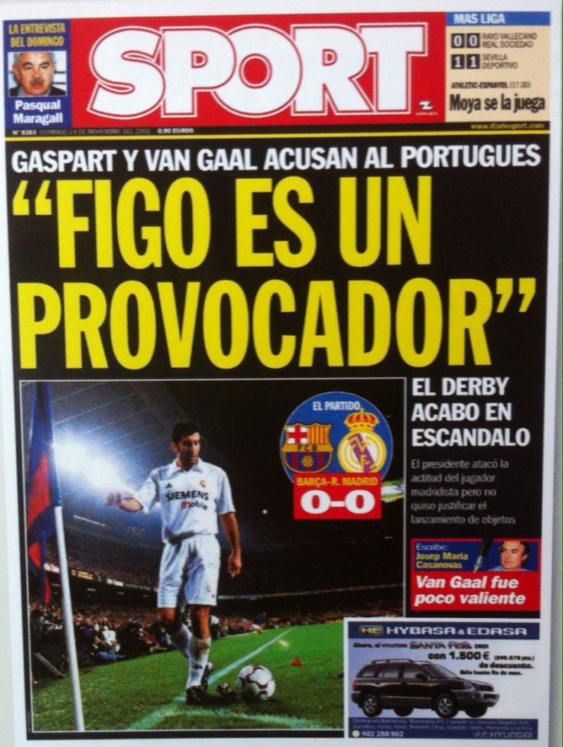Esta (esta y no otra) fue la portada de Sport el día siguiente al tristemente célebre día de Figo y la cabeza de cochinillo en el Nou Camp. Entonces sí importaba la actitud de los jugadores hacia la grada. Con una diferencia fundamental: la provocación de Figo a la multitud blaugrana en aquella fecha aciaga consistió en intentar tirar un córner.
