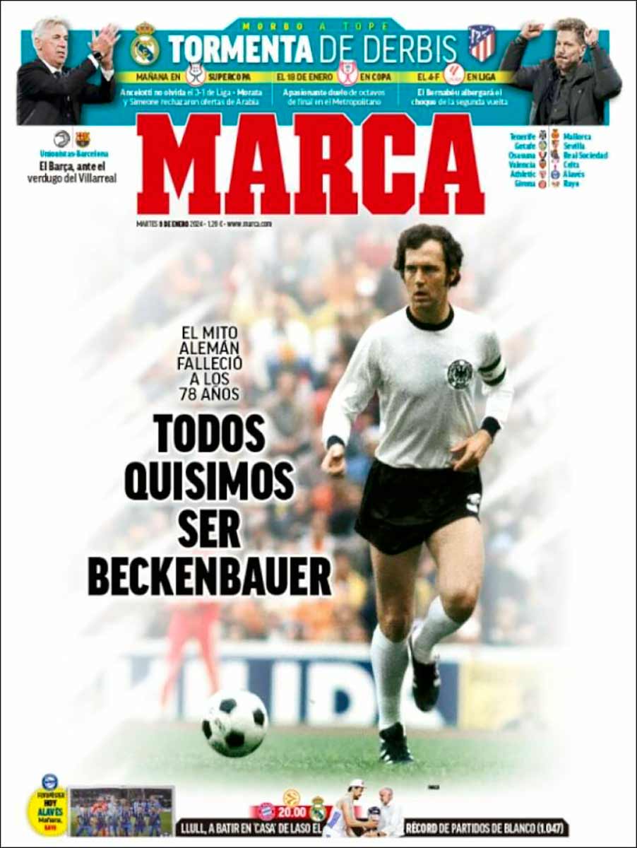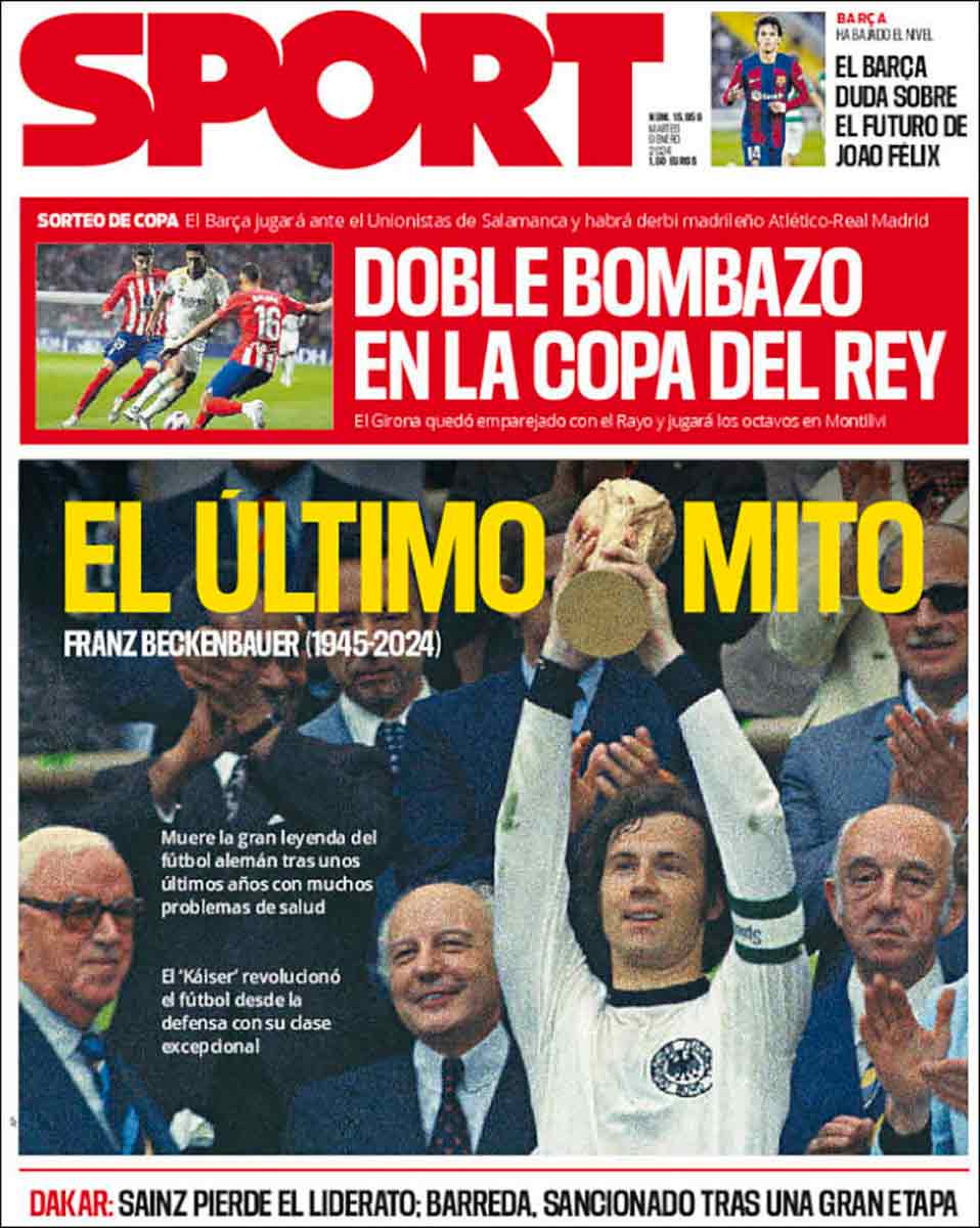 Mundo Deportivo opta, acertadamente, por una sobria portada en negro con Beckenbauer alzando la Copa del Mundo de 1974. «El fútbol despide al mito alemán, uno de los mejores jugadores de la historia», subtitulan a la sombra del titular «Adiós al Káiser».