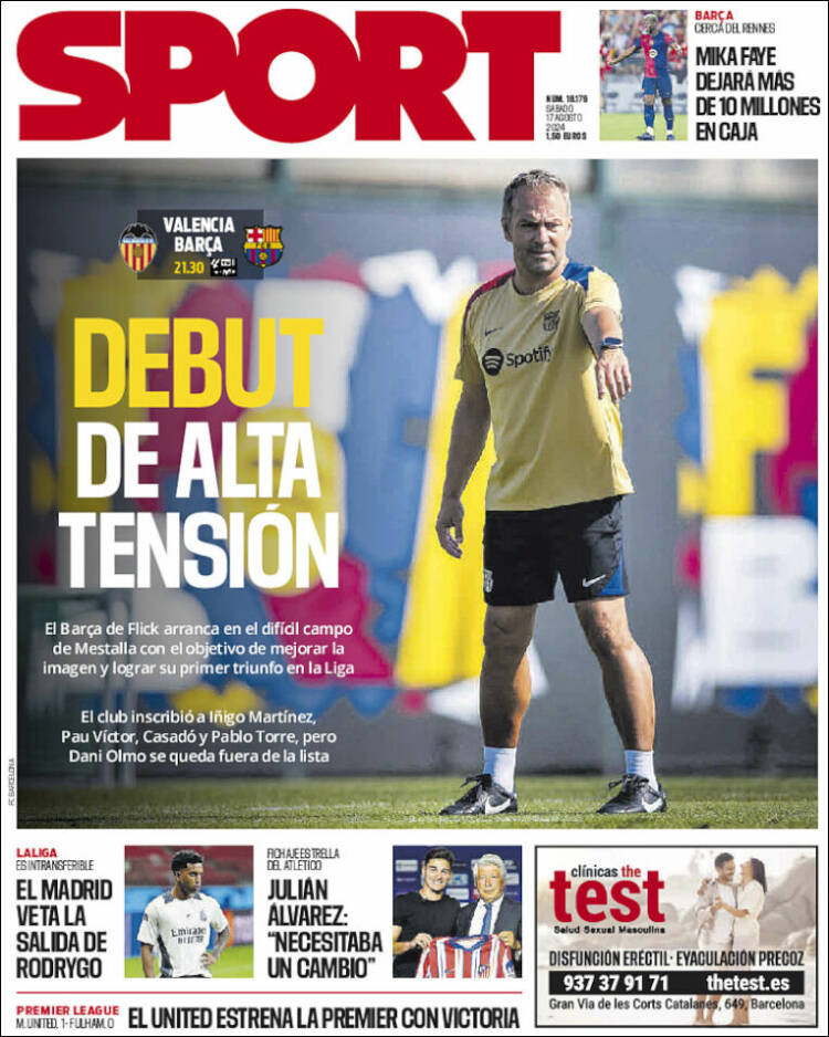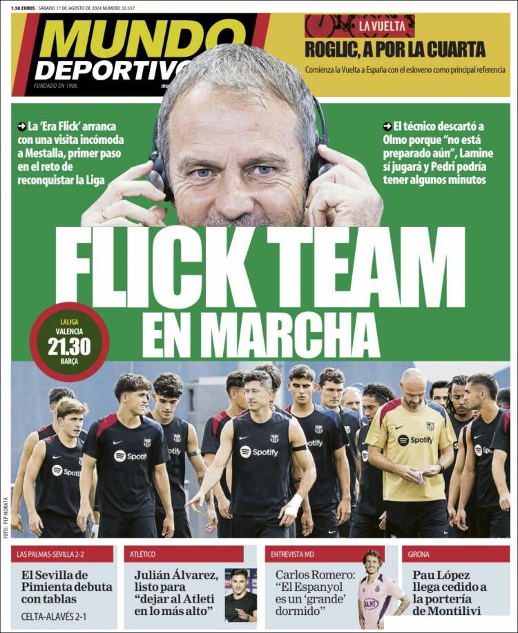 Pero, antes de que se estrenen los de Ancelotti en Mallorca, lo hará en Valencia el equipo cliente de Negreira. No se puede decir que este debut llegue en un momento de euforia para el culerío, y como muestra de ello valga la portada de Mundo Deportivo de hoy. ¿Leéis lo mismo que nosotros?