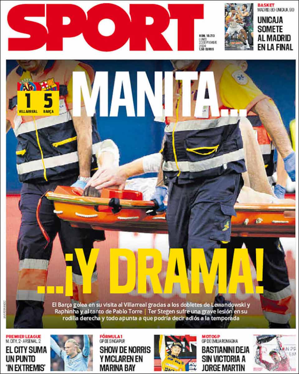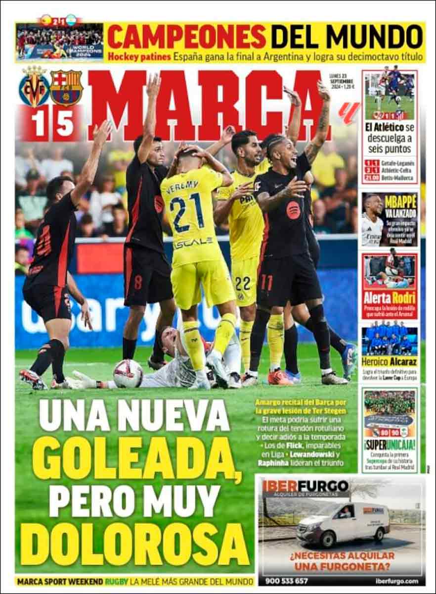 Verá, D. Tatxo, de Marca no cabe esperarse el menor atisbo de libertad informativa, por cuanto sus finanzas dependen en gran medida de las dádivas de su socio Tebas (socio de ustedes, no de ellos, aunque también), y no van por tanto a estropear la imagen de la impoluta Liga Negreira que gozamos todos. Por eso nos cuenta lo que pasó en la Cerámica: primero, que Ter Stegen se lesionó de gravedad (cosa que lamentamos), y segundo que el Barça ganó 1-5. Lo que nos oculta Marca en esta portada centralecheiril es que el Villarreal llegó a empatar a dos, pero su gol fue anulado por el fuera de juego semiautomático que es (volvemos al principio) más semi que automático.