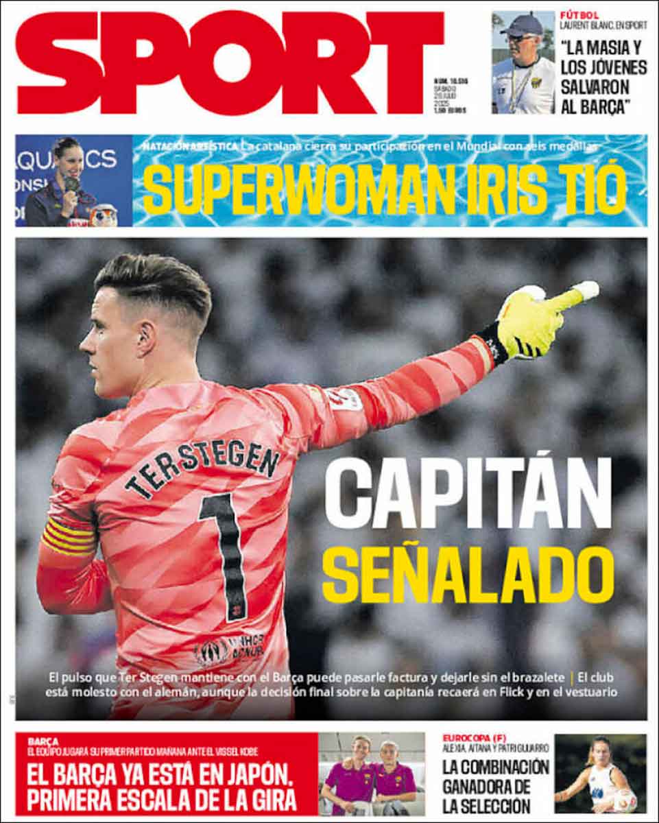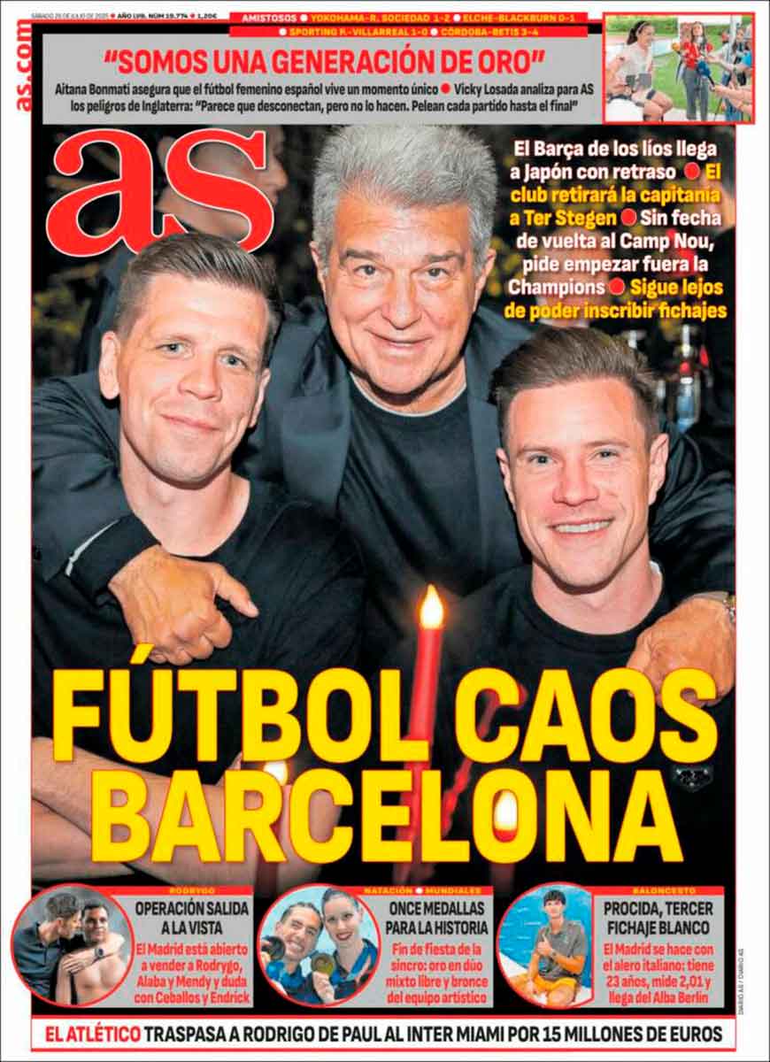 La actualidad deportiva trae otras noticias de interés, como la final de mañana de la Eurocopa de fútbol femenino, la incorporación de De Paul al equipo de amigos jubilados de Leo Messi o la fenomenal participación del equipo español en los mundiales de Natación. Las cabriolas de la portada de Marca casi alcanzan el nivel de las que ejecuta sin maestría Jan Laporta, y mezclamos la brillantez de unos y la opacidad del otro porque creemos haber encontrado un mensaje común en las portadas del Mundo Deportivo y de Marca.