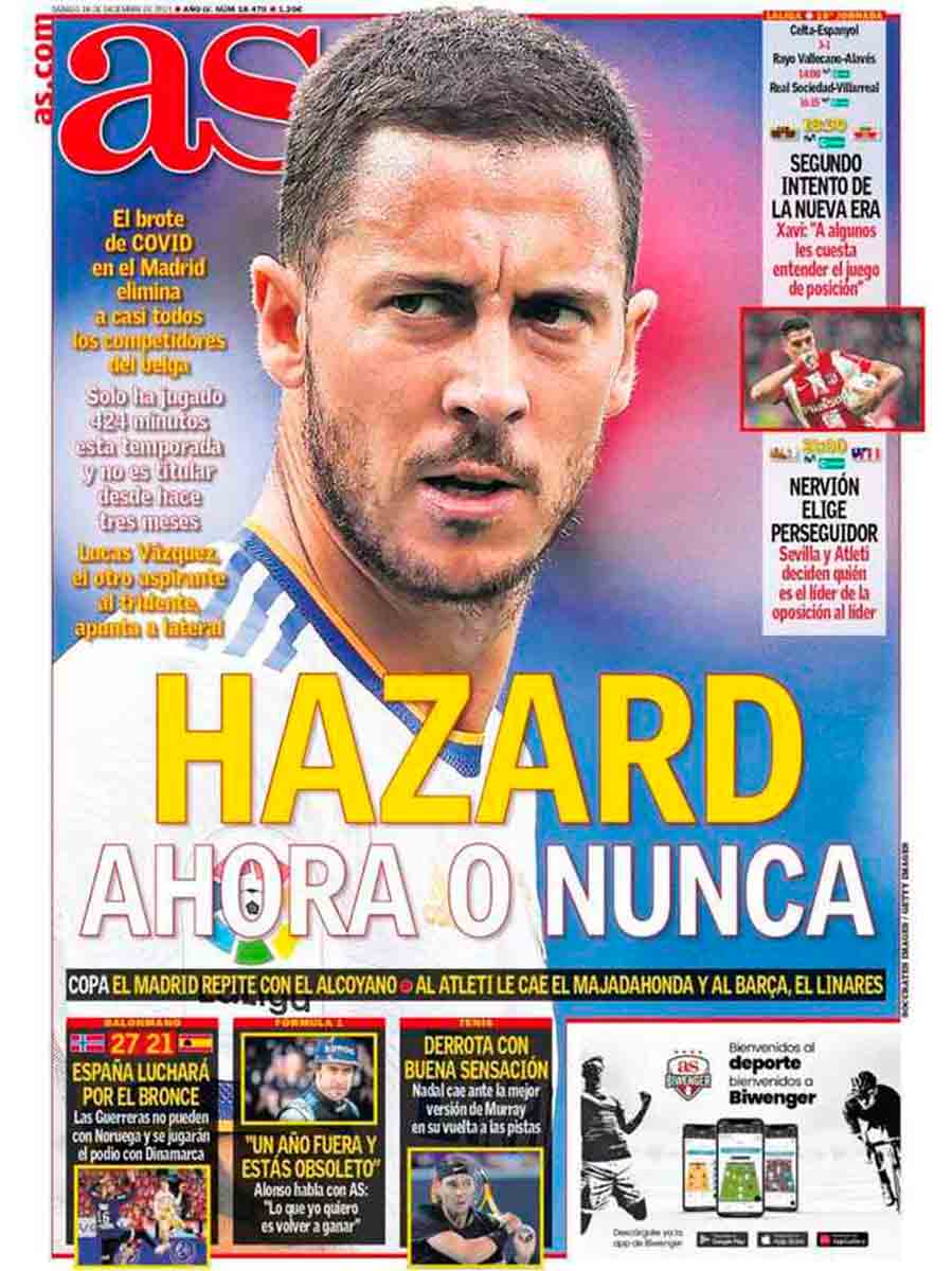 Un nuevo ultimátum en el Madrid, otro examen, prueba de fuego, test final y todos esos tópicos habituales que se han regalado en estas páginas a Hazard, Courtois, Militão, Jovic, Bale, Kaká y un larguísimo etcétera de jugadores blancos. It’s now or never, que cantaba Elvis Presley. Ya no sorprende que la portada se dedique a destacar un nuevo problema en el Real Madrid, que juega mañana, en lugar de hablar del duelo de perseguidores que se disputa esta noche en el Sánchez Pizjuán entre los locales y el Atlético de Madrid. Las cosas de la prensa “madridista”.