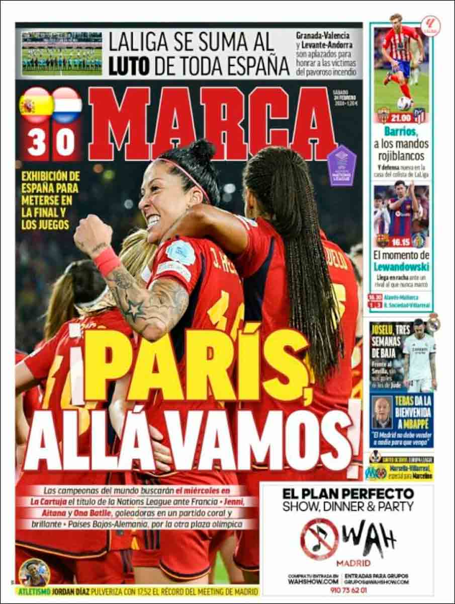 Aunque no destaca por lo que creéis, pero ya llegaremos a ello. Las portadas se centran en el éxito de las jugadoras de la selección española de fútbol, las cuales, tras la goleada a Países Bajos, han logrado la hazaña de la clasificación de España para los Juegos Olímpicos por primera vez en nuestra corta historia de éxitos. Una historia recién comenzada con el pasado Mundial y que podría aumentar la próxima semana en la final de la Nations League.
