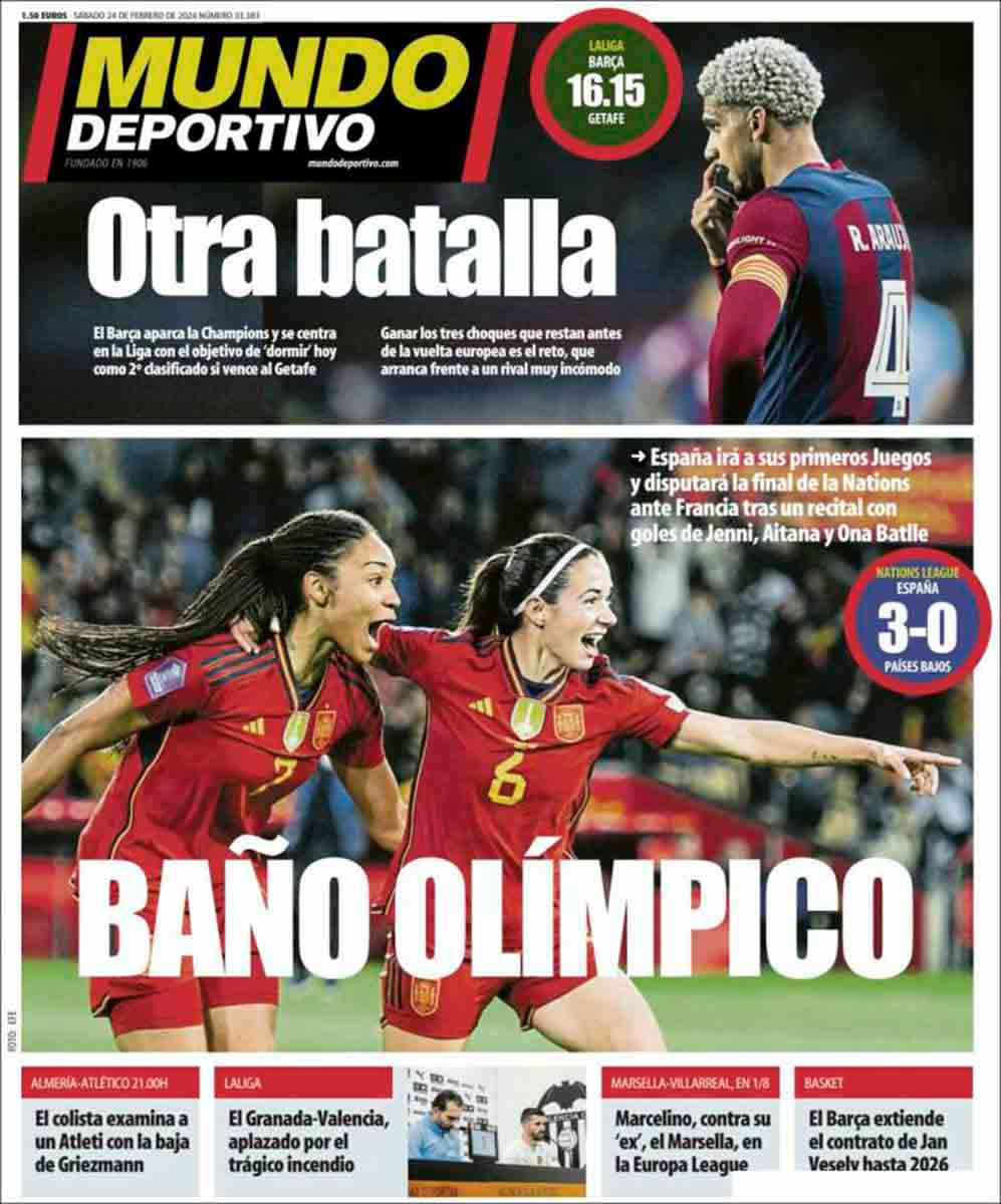 Mundo Deportivo reparte su portada entre el “baño olímpico” de las futbolistas, con las culés Aitana Bonmatí y Salma Paralluelo, y esa “otra batalla” consistente en colocar al Barça en segunda posición. En puestos de Supercopa, por decirlo de otra manera.