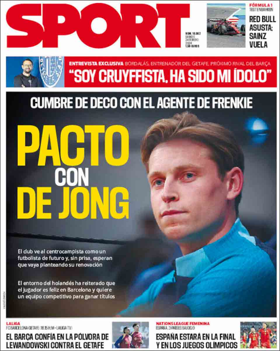 Y os dejamos ya con la portada discordante, la del diario Sport, no solo porque no lleva al lugar principal el éxito de la selección femenina de fútbol para mostrarnos en su lugar el rostro radiante y eufórico de Frenkie de Jong…