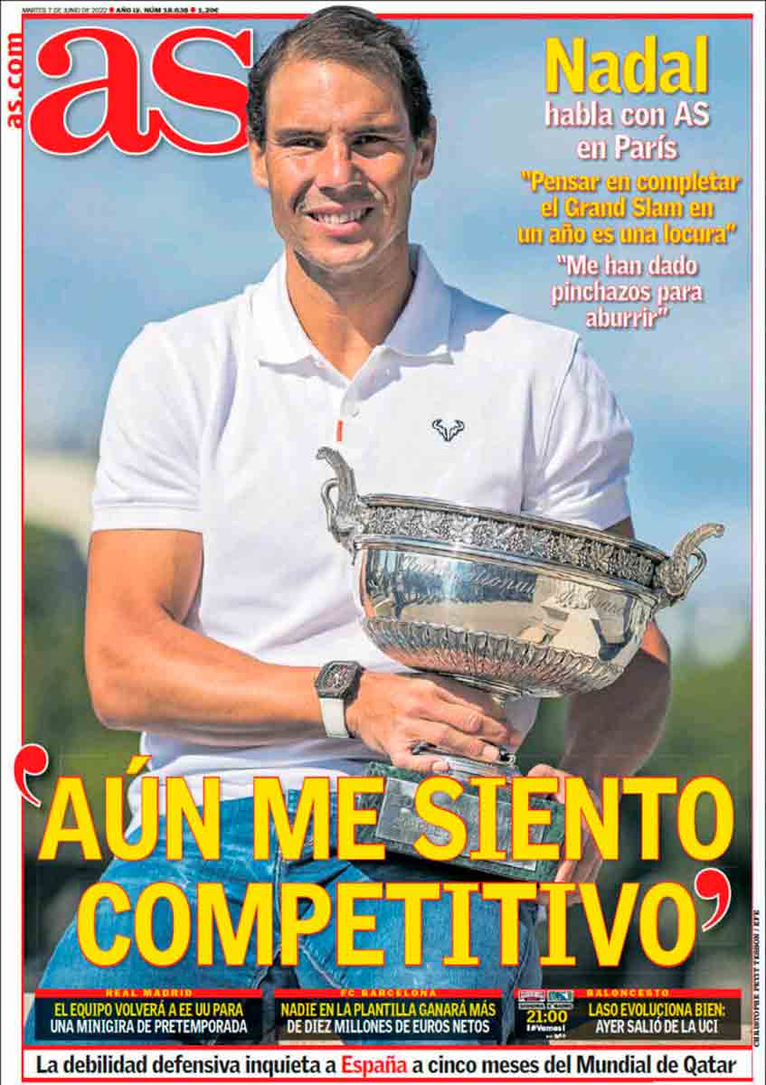 La portada de As es para Nadal. Y la mayor parte del frontispicio de Mundo Deportivo, también. Rafa asegura que aún se siente competitivo, pero que no temería un adiós porque es feliz fuera del tenis. Bien, Rafa, la salud es lo más importante.
