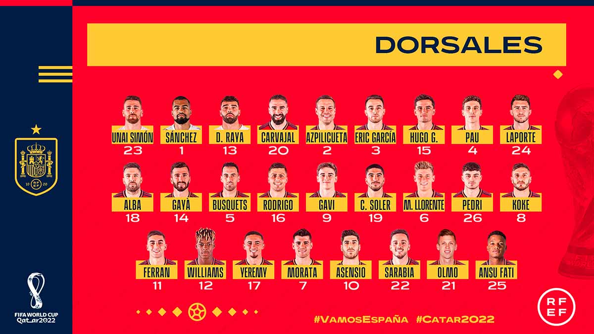 Unai Simón, Robert Sánchez, David Raya; Dani Carvajal, César Azpilicueta, Éric García, Hugo Guillamón, Pau Torres, Aymeric Laporte, Jordi Alba, José Gaya; Sergio Busquets, Rodri, Gavi, Carlos Soler, Marcos Llorente, Pedri, Koke; Ferran Torres, Nico Williams, Yeremi Pino, Álvaro Morata, Marco Asensio, Pablo Sarabia, Dani Olmo y Ansu Fati.