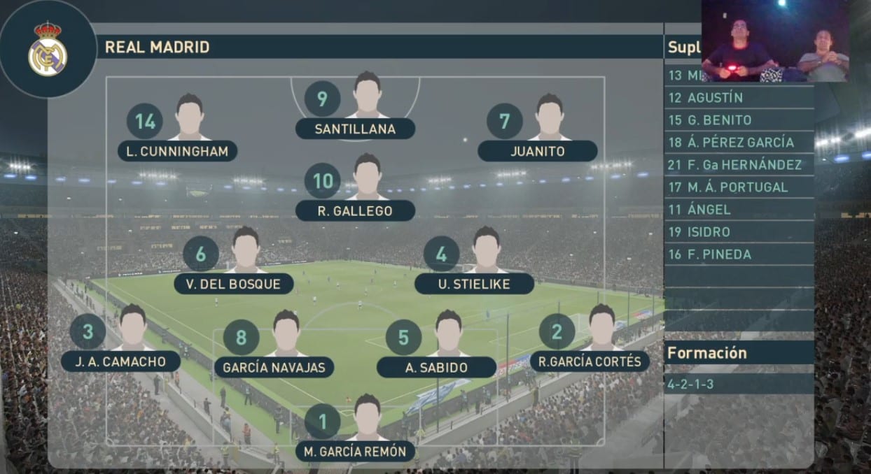 Claro. Miguel Ángel en la puerta, Camacho en un lateral e Isidoro San José en el otro. De centrales Benito y García Cortés, incluso Bonet que era finísimo, aunque si me voy más allá Tendillo, que para mí ha sido el mejor. Me decido por Benito y Tendillo. En el medio metería a Ángel, Del Bosque y Stielike. Y delante Cunningham, Santillana y Juan Gómez Juanito. ¿Por qué? Pues porque es ese Madrid de los ochenta que a mí me parecía espectacular. Aunque me gustaría meter al Buitre que me parecía increíble. El Buitre me caía muy bien, jugaba con los apuntes a un lado y con un reloj con el que parar el tiempo al otro. Era un show absoluto.