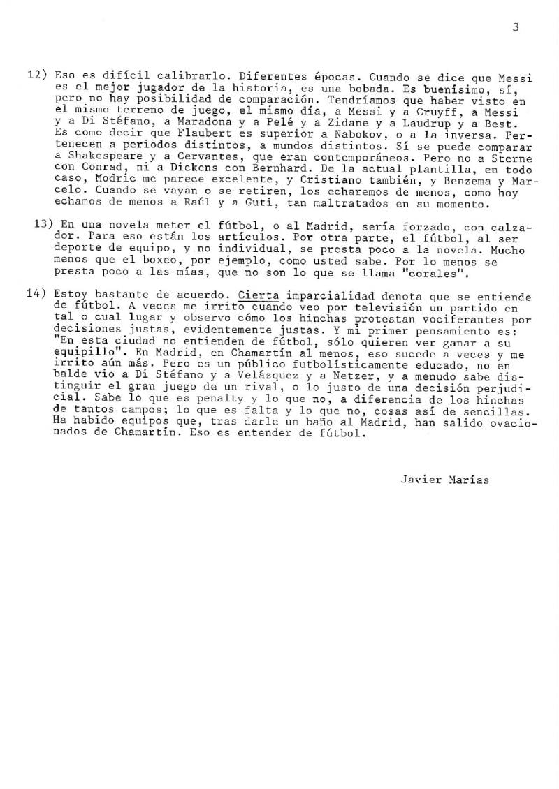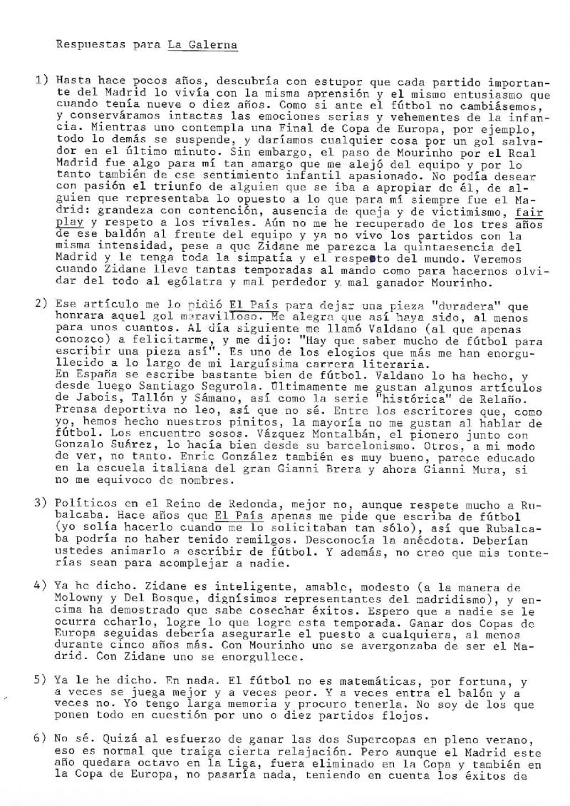 R: En una novela meter el fútbol, o al Madrid, sería forzado, con calzador. Para eso están los artículos. Por otra parte, el fútbol, al ser deporte de equipo, y no individual, se presta poco a la novela. Mucho menos que el boxeo, por ejemplo, como usted sabe. Por lo menos se presta poco a las mías, que no son lo que se llama “corales”.