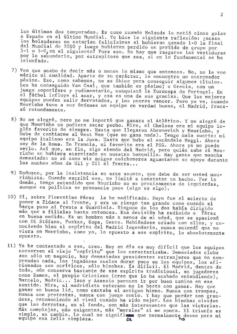 P: En otro artículo confesó: “Recuerdo haber preferido que una Final de Copa se la llevara el Atleti (como así fue) antes que ver a Mourinho chulearse de haber logrado el trofeo”. La frase parece describir un sentimiento de deseo de victoria del Atleti antes o durante el partido, pero no deja claro si, una vez concluido el mismo, usted en efecto se alegró de la victoria de los de Simeone… No es lo mismo. ¿Lo podría aclarar?