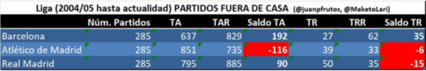 Una cosa razonable. Pero claro, la diferencia por tanto viene fuera de casa, donde el Barcelona tiene un saldo de tarjetas rojas de +31, mejor incluso que en casa, lo cual es curioso.