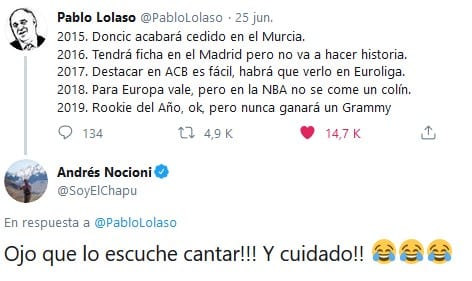 De hecho, hasta entonces, los jugadores del Real Madrid a ti te seguían pero ninguno interactuaba contigo públicamente. A partir de ese momento sí salieron todos del armario y comenzaron a contestarte, a bromear, a replicar tus tuits, lo de Llull mostrando a su hija con uno de tus bodys "del campo atrás", hasta Luka te retuitea desde Estados Unidos…