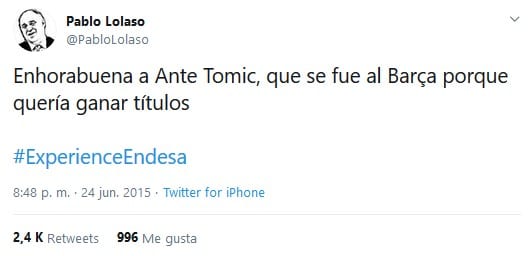 Sinceramente, es del único que nunca me ha constado que ni le ofenda ni le deje de ofender y quiero pensar que es porque le resbala. Que también es una buena opción. Preocuparte de lo que dice un idiota por una red social. Ofenderte por lo que dice un tipo de Móstoles que está en su casa escribiendo tonterías por el móvil… si es que es absurdo. Pero habría que preguntárselo a alguien del Barcelona. No sé si alguno de los del Madrid tiene contacto con él. Aunque sí que sé que a los jugadores del Real Madrid les hace gracia cuando me meto con Tomic. Es normal. Hay que entender también lo deportivo como una diversión, si no esto sería muy aburrido.