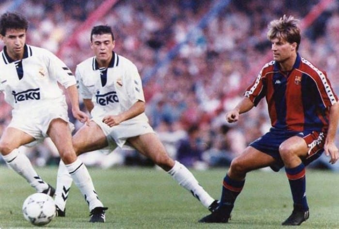 Sí, pero yo no he visto nunca esa intención del Madrid de intentar replicar lo hecho en Barcelona. Al Final el Barcelona tiene una forma de entender el fútbol y el Madrid otra. El camino del Madrid ha girado siempre en torno a fichar a los mejores jugadores,  mientras el del Barça ha estado más en formarlos. Conmigo quisieron fichar un buen jugador, no creo que haya más. Claro, yo tengo un recuerdo malo de mi inicio. Como me iba al eterno rival, en el Barça tomaron la determinación de dejarme sin jugar, ahí me pierdo ir a la Selección, esa es una. Me quedo sin ir al Mundial de Italia. Una vez en Madrid, a los 15 días de llegar, me rompo el cruzado. De inicio. Así que prácticamente me pierdo casi toda esa temporada, quitando los últimos siete partidos con Antic, que además fue una temporada mala porque cesaron a Toshack. Y al final puedo jugar los últimos siete partidos y luego iniciar la temporada siguiente. La verdad que no fue un inicio muy prometedor, pero luego tuve una experiencia muy buena. En lo personal, porque a raíz de eso me asiento en Madrid, donde nacen mis hijos. En lo deportivo, tuve la suerte de ganar dos Ligas y dos Supercopas, la segunda después de la Liga de Valdano.