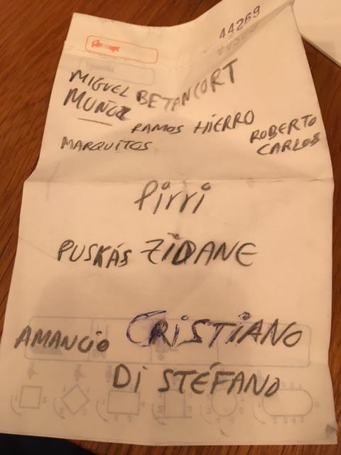 R: A Miguel Muñoz (lo escribe en la servilleta). Pondría a Zidane, pero me parece muy ventajista ponerlo ahora. Además, eso me privaría de ponerlo como jugador.