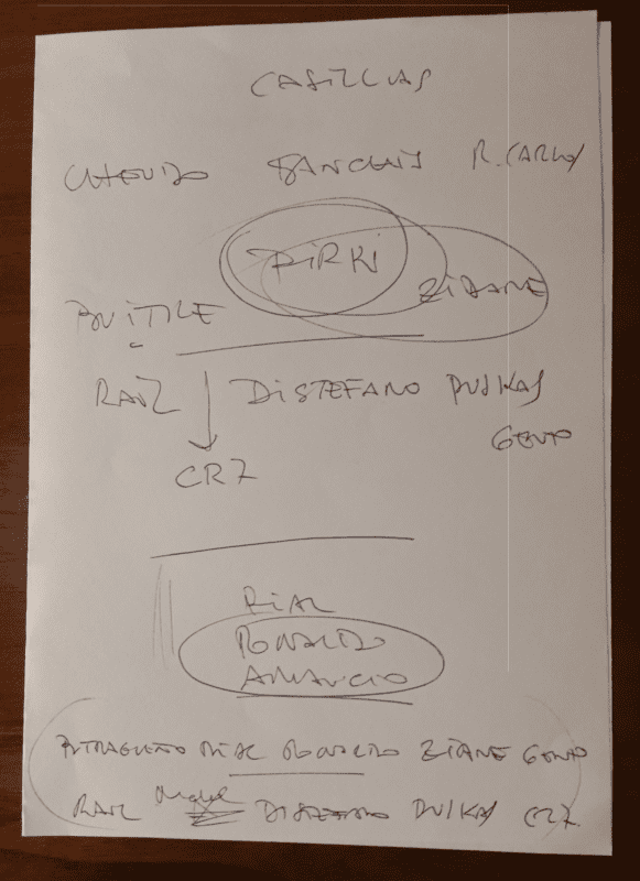 R: Y me faltan por poner Cristiano y Gento – escribe los dos nombres -. ¡Es que no hay más remedio que meter una delantera con Cristiano, Raúl, Puskas, Di Stefano y Gento!