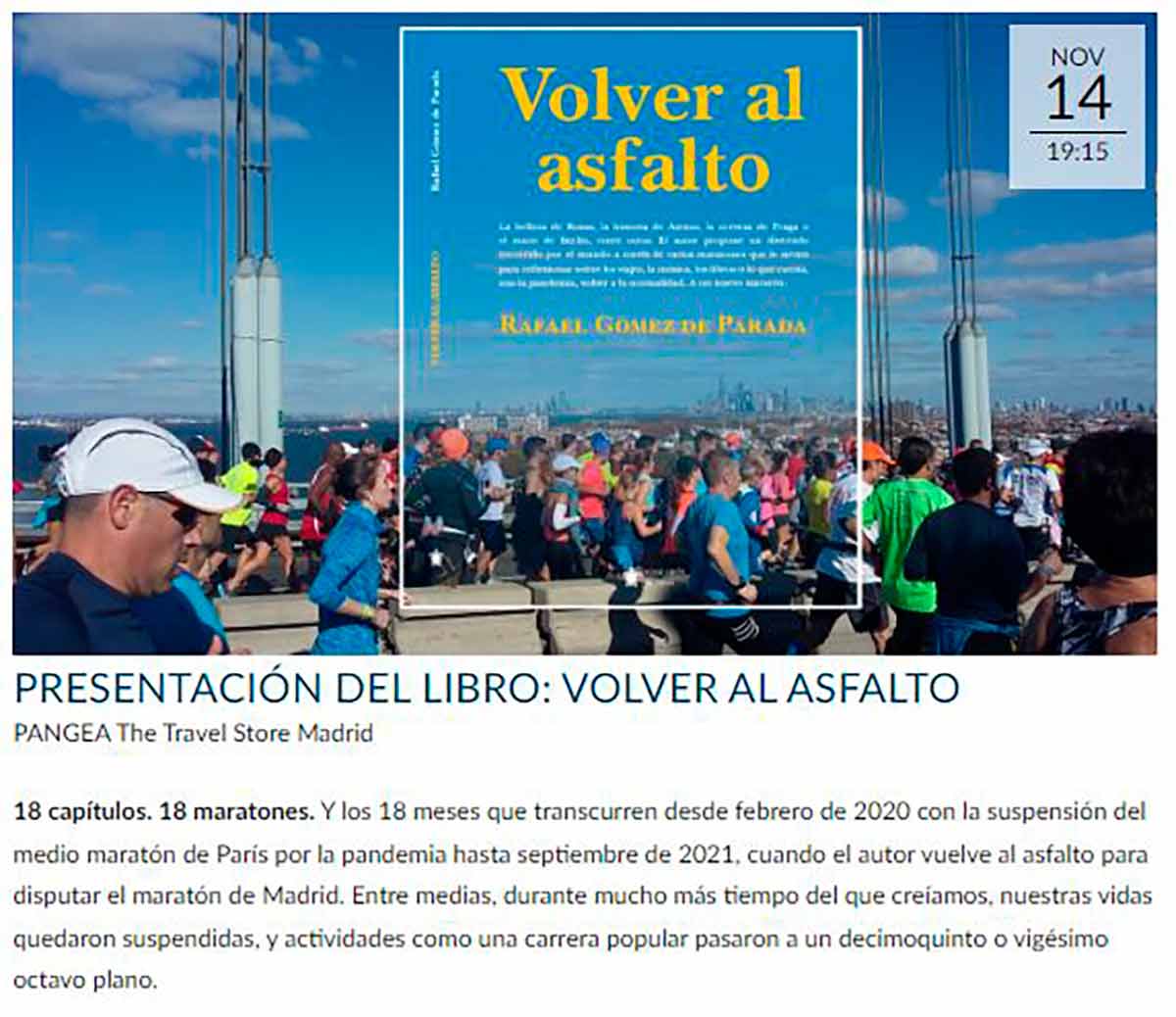 El libro comienza en París el 29 de febrero de 2020. Yo estaba recogiendo el dorsal para el medio maratón que iba a correr con mis hijos al día siguiente, y se suspendió por ese virus de China que ninguno nos tomábamos en serio. Allí vi el último partido que se jugó en el Bernabéu en mucho tiempo, el Madrid-Barça del 2-0 y el gol de Mariano, donde escribí “París bien vale un Clásico”. Y el libro termina con el capítulo del maratón de Madrid 18 meses después, que también conté aquí (La Galerna en el maratón de Madrid) y en el que, por cierto, os anticipé que terminaba un libro y comenzaba otro maratón, el de la búsqueda de editor. Durante ese tiempo pasaron muchas cosas en mi vida, al igual que en las de tantas personas, y en cada capítulo voy dejando un pequeño recuerdo de lo que ese año y medio supuso en mi caso: lesiones, familiares afectados por el covid, limitaciones para todo. El título “Volver al asfalto” representa ese tesón, la perseverancia, la disciplina, todo lo necesario para volver y terminar de nuevo un maratón.