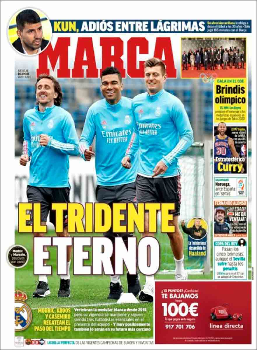 En la portada de Marca aparece uno de estos últimos positivos del Madrid, Luka Modric, junto a los otros dos mosqueteros del centro del campo blanco: Casemiro y Kroos. Si Di Stéfano Puskas y Gento fuesen un libro, serían la Biblia, y si lo fuese la CMK, sería El Quijote. “Tridente eterno” titula Marca. Cierto, ni el tridente de Poseidón ha generado más tsunamis de fútbol.