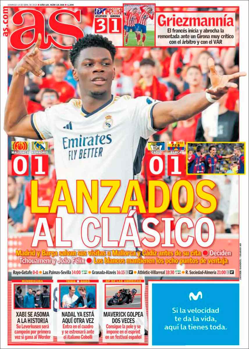 "Lanzados al clásico", titula As, aprovechando el lanzamiento (metafórico) de arco que usa Tchouaméni para celebrar sus goles. No fue un gran partido (aquí tenéis la crónica y las notas de Ramón Álvarez de Mon), pero el Madrid habría sentenciado mucho antes del final de haber acertado mínimamente con la portería Brahim y Valverde en ocasiones manifiestas. Las prestaciones generales del equipo mejoraron en el segundo tiempo con la entrada de Camavinga, si bien era difícil mantener la mente alejada de Manchester.