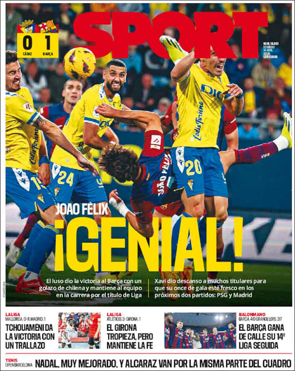 Sport ilustra su portada con una bonita foto del (a su vez) bonito gol de João Félix que dio el triunfo a los culés en Cádiz. No sólo la foto es estéticamente bonita, sino que sirve de perfecta prueba de que es un gol ilegal por juego peligroso. Los chicos de Sport no han debido de reparar en que su portada de hoy es documento gráfico de la pervivencia del negreirato, ahora en su versión 2.0.