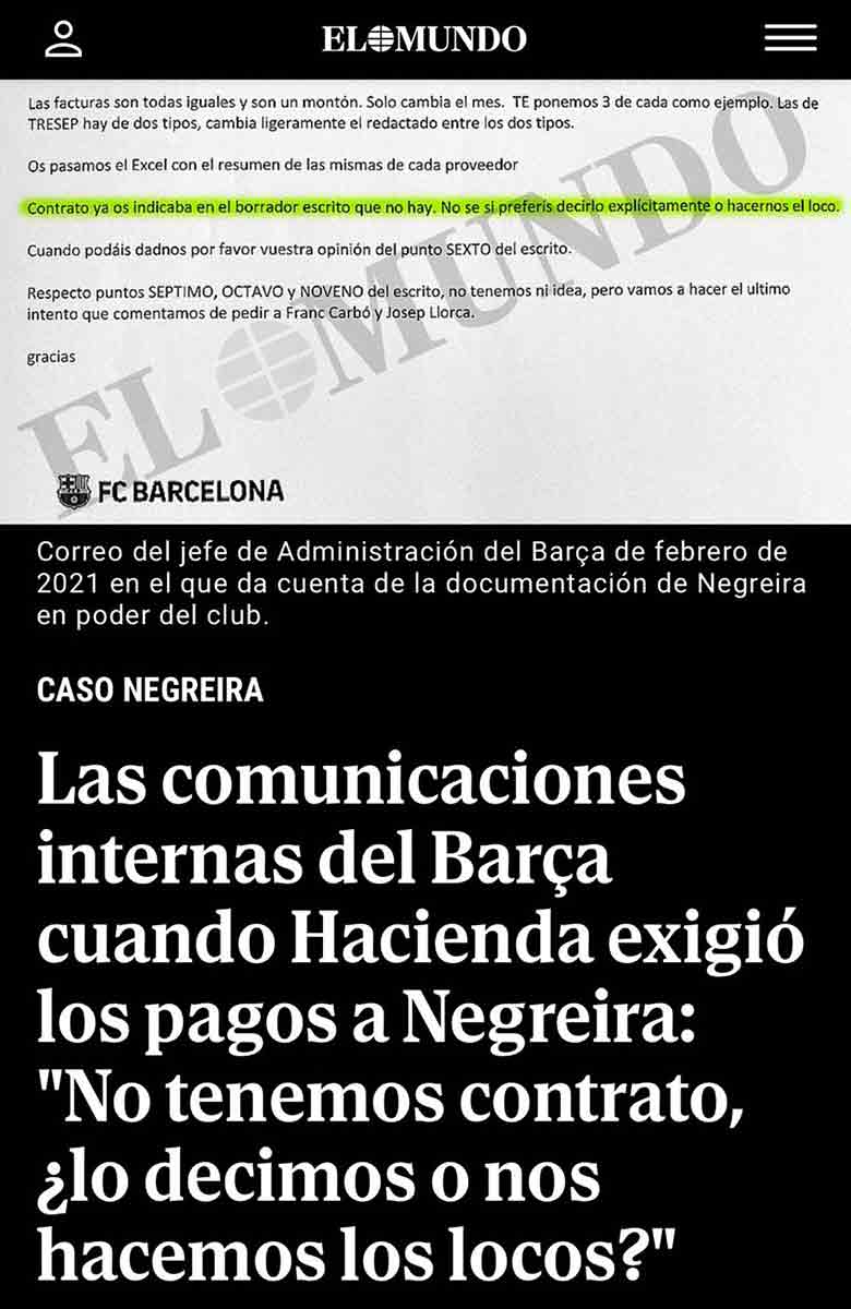 Hoy El Mundo nos trae unos correos electrónicos internos del Barça. Cuando Hacienda pide documentación relativa al fraude arbitral que esta gente estaba llevando a cabo, parece cundir un cierto pánico, y alguien pone por escrito la gran pregunta: “No tenemos contrato, ¿lo decimos o nos hacemos los tontos?”