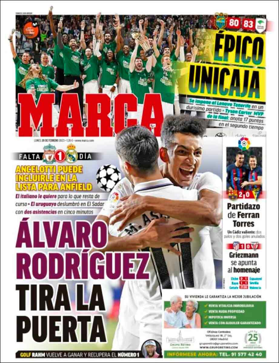 Como decíamos, comienzan a apagarse en las primeras planas de la prensa deportiva madrileña los ecos del BarçaGate. Marca viene con la fantástica irrupción de Álvaro Rodríguez, delantero enormemente prometedor del Castilla que dejó dos asistencias en sus escasos minutos en Pamplona. Bravo por él.
