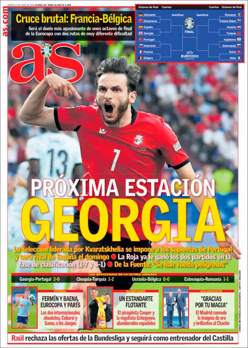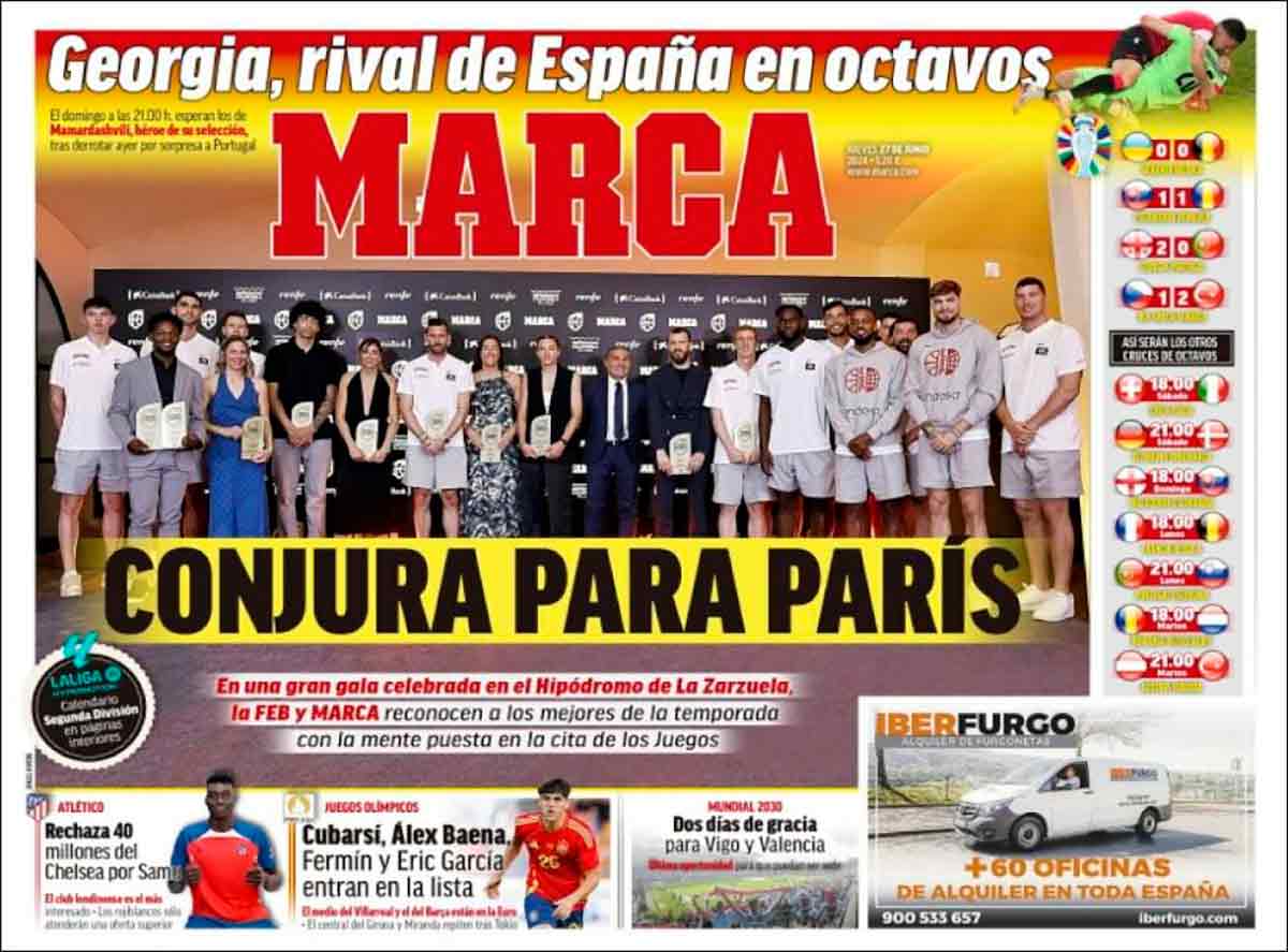 Y Marca no tiene a Georgia en su mind, sino en su azotea, porque hoy despachan una portada apaisada que lleva por título «Conjura para París» y prioriza la gala celebrada en el Hipódromo de la Zarzuela en la cual la publicación y la Federación de Baloncesto reconocieron a los mejores de la temporada. Aunque el mejor será siempre el Madrid: apostar por los blancos es hacerlo a caballo ganador.