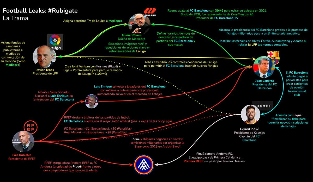 Piqué negocia con Rubiales la organización de la Supercopa de España en Arabia Saudí y cobra una comisión millonaria por la intermediación. Rubiales se enriquece con esta operación, tiene un plus económico personal estipulado en su contrato por llevar a cabo el negocio. Piqué juega en el Fútbol Club Barcelona. Piqué es dueño del Andorra. Existe una penalización económica en caso de que Barça o Real Madrid no participen en la Supercopa de España. Rubiales es el responsable último del arbitraje y de las competiciones en las que participa Piqué como jugador y dueño de club.