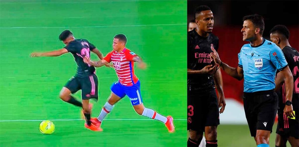 Los primeros 25 minutos del colegiado fueron para olvidar. Totalmente calamitosos y esperpénticos. En el minuto 7 enseñó cómo no debe ser arbitrada una ley de la ventaja en una acción de Valverde en la que fue agarrado del pantalón. Pero lo peor fue a continuación, al dejar pegar al Granada al más puro estilo UFC sin mover un músculo y castigarles por ello. Y es que en el 18' una entrada durísima de Eteki a Valverde dejó al uruguayo atendido varios minutos en la banda. No fue amonestado. Pero lo del 25' ya fue una obra compartida con Cordero Vega en el VAR que estaría más pendiente de Supervivientes que del partido. La entrada de Machís a Marvin fue salvaje, con los tacos clavados entre el gemelo y el talón del madridista que le produjo una rotura de la media. Una roja clara en el campo y en el monitor. Pues ni amarilla. La primera del duelo se la llevó un madridista, concretamente Militao en el 37. No podemos decir que fuese una sorpresa (aclaramos que la amonestación, no el receptor). Antes del descanso, por fin un granadista fue apercibido: Jorge Molina.
