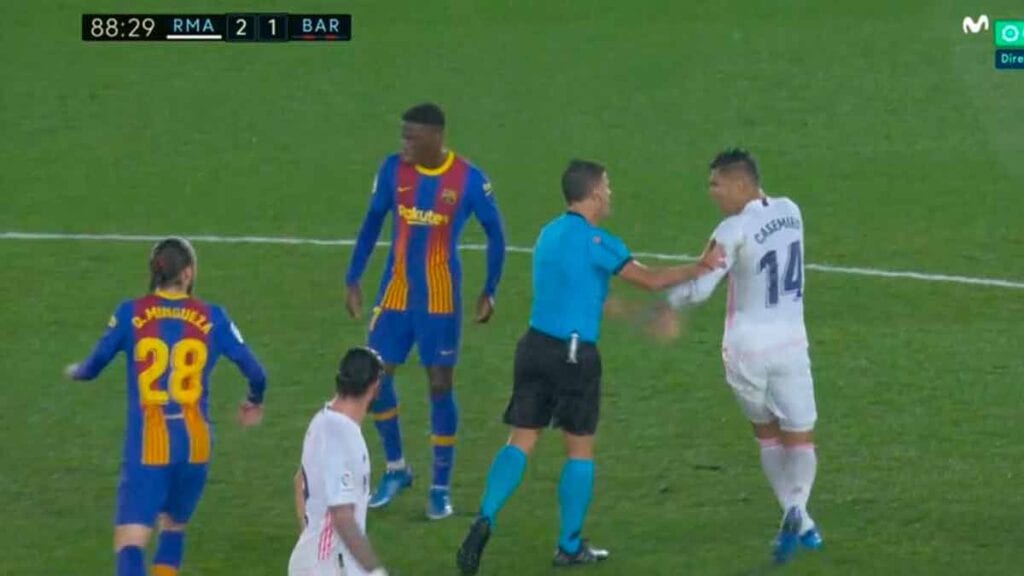 En la segunda parte en el cuadro madridista fueron amonestados Nacho por una falta a Messi en la frontal y Casemiro por partida doble en apenas dos minutos, lo que le conllevó la expulsión. Las dos amarillas eran justas por llegar tarde ante Messi primero y Mingueza después. También resultaron amonestados en el Barcelona Sergi Roberto y Koeman por protestar. El origen de sus desmedidas reclamaciones fue una acción de Mendy sobre Braithwaite donde pedían penalti en el minuto 84. Y las repeticiones no dejan lugar a dudas de que el toque del francés al danés es mínimo, siendo totalmente insuficiente para que el balón se situase en los once metros. El fútbol es un deporte en el que está permitido el contacto y no cualquier leve roce o fricción es falta.