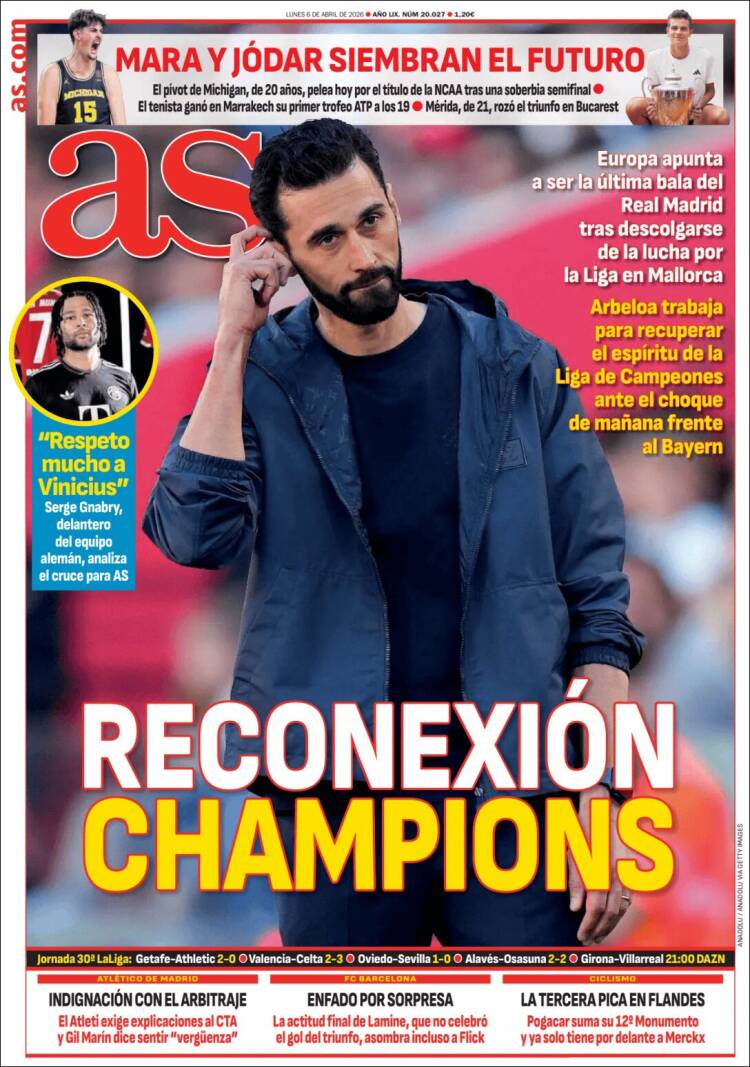 Por lo demás, el As dedica el grueso de la portada al excitante partido de ida de cuartos contra el Bayern de Munich, que ya lo tenemos llamando a la puerta. “Reconexión Champions” titula el As, y votamos a bríos que no está mal traído el término. Reconectar le hace falta al equipo: con la tensión competitiva y con su afición, porque si algo describe lo que muchos madridistas experimentaron el sábado es una absoluta desconexión entre lo mucho que a ellos les concernía lo que el equipo se estaba jugando en Son Moix y la actitud que transmitieron los jugadores.