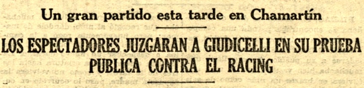 El domingo 15 de diciembre, Giudicelli saltó al césped de Chamartín en el once dispuesto por Paco Bru. Lo hizo ataviado con su habitual boina y junto a Alberty; Ciriaco, Quincoces, P. Regueiro, Leoncito, Méndez Vigo, L. Regueiro, Sañudo, Lecue y Emilín. Visitaba el campo madridista el Racing, que ocupaba la cuarta posición de la tabla. En un duelo magnífico, con gran inspiración y juego veloz, los cántabros se hicieron con el triunfo por 2-4, y los madridistas perdieron el liderato y la imbatibilidad en su feudo. La actuación de Giudicelli en la media fue muy mala y su futuro de blanco quedó sentenciado. En la prensa algunas críticas a su actuación fueron feroces.