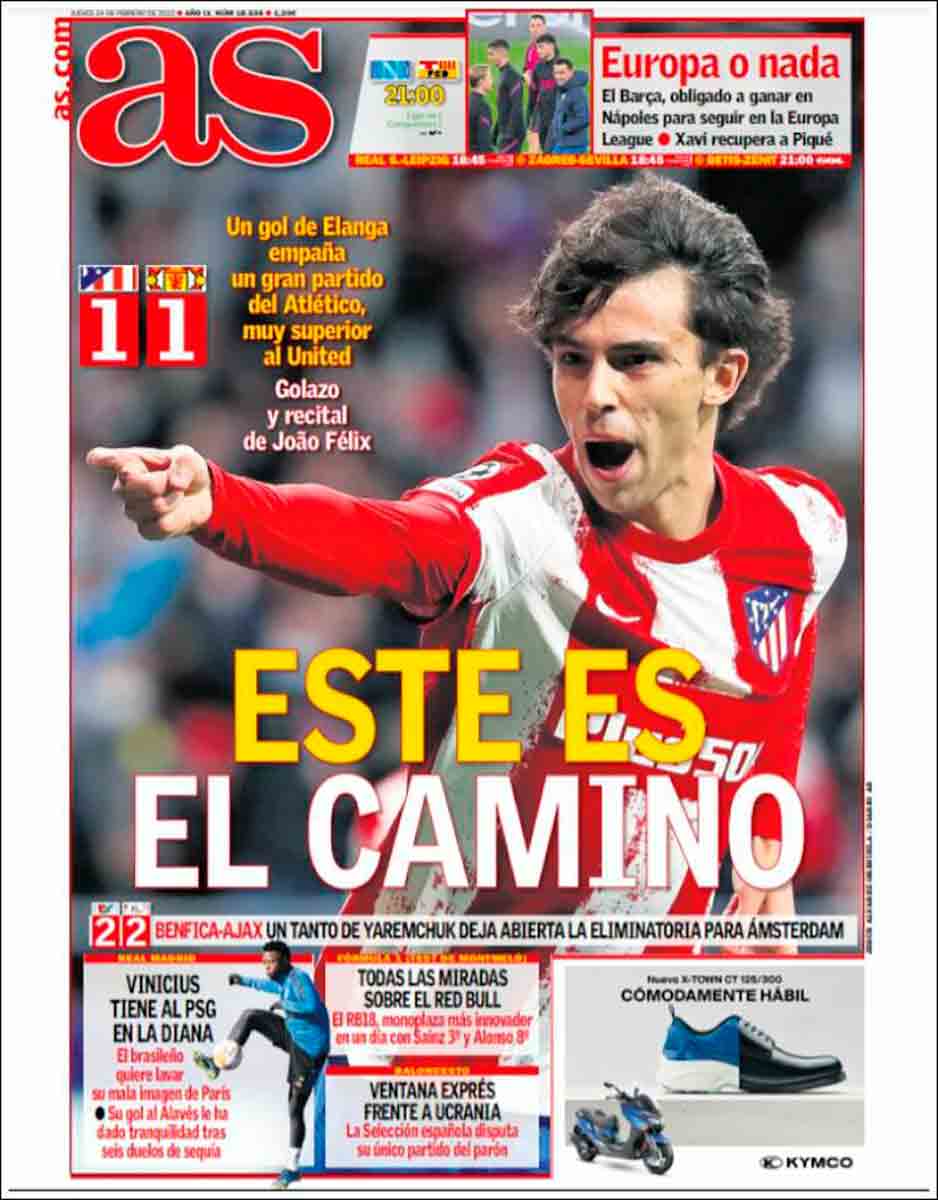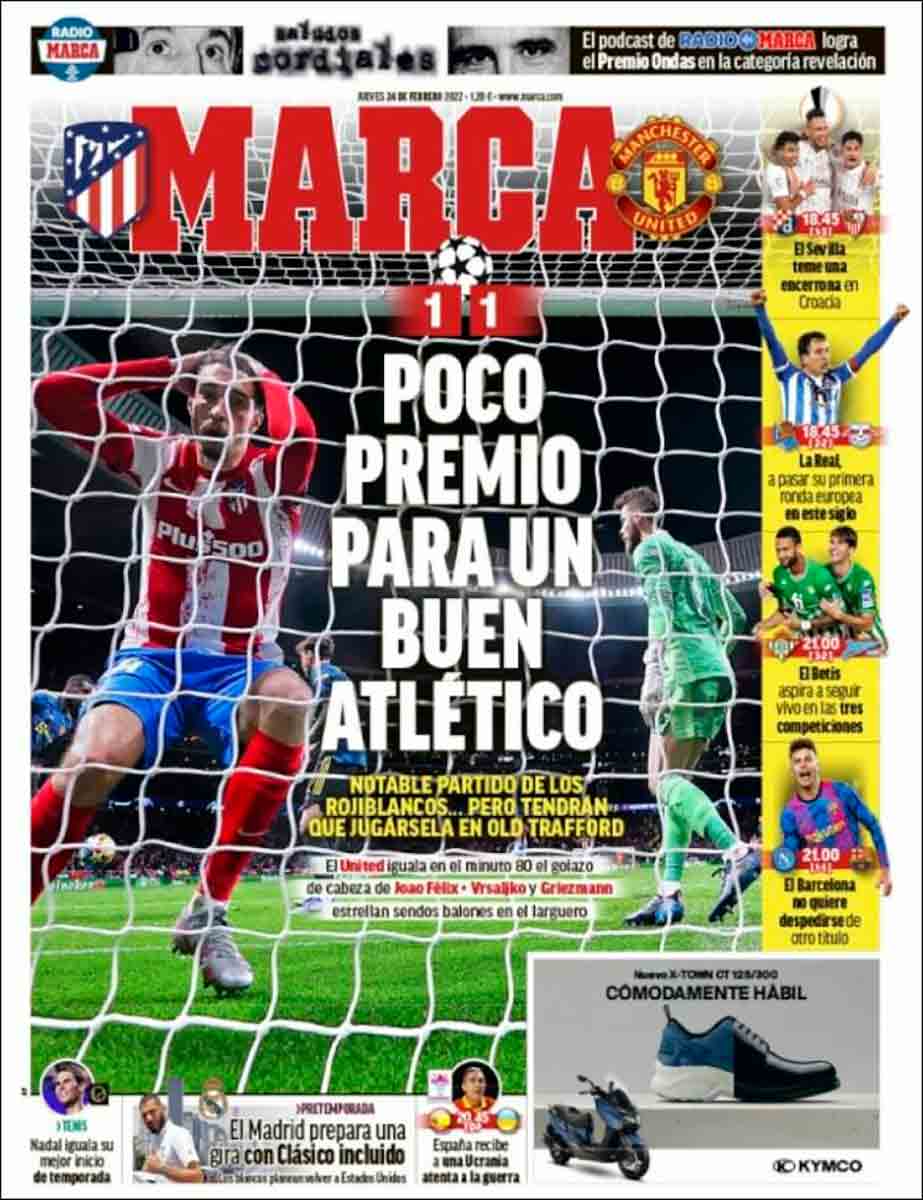 Hoy sí (!!!con un empate en casa¡¡¡) es portada el Atleti en los dos panfletos mesetarios, cuando pierde va en chiquitito por si Cerezone se cabrea. Anoche después del partido la Marchante le dio un repaso de baño y masaje en la zona mixta al que junto a los Gil le robó el club a sus socios...