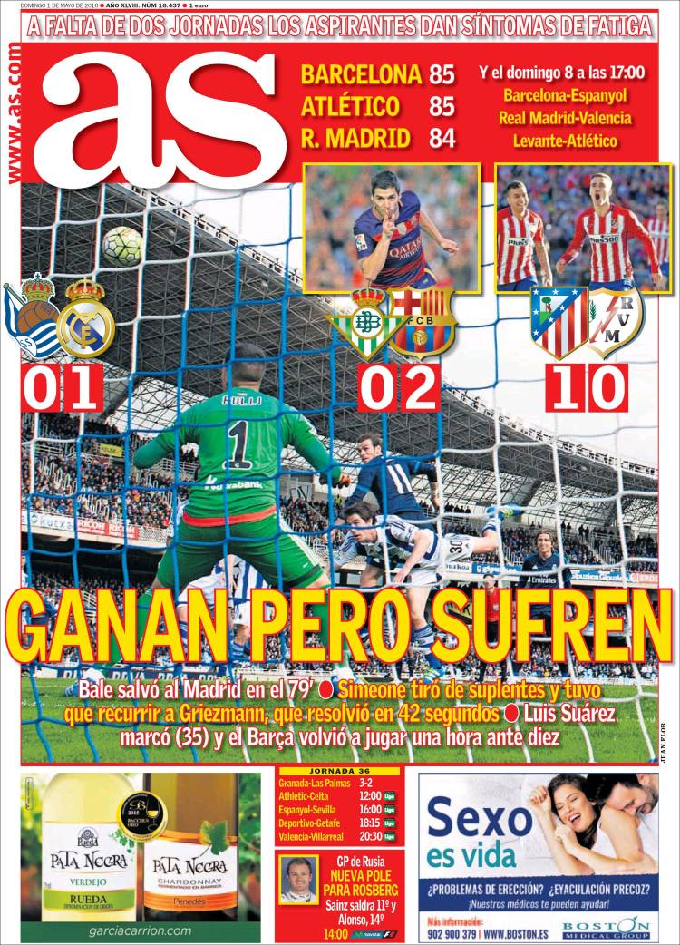 Por su parte, As opta por darle un sesgo trágico a la jornada de ayer, constatando la dificultad de las victorias de los tres equipos que disputan el título. "Bale salvó al Madrid en el 79'", dice el diario de Relaño, y no tendríamos problema en asumir el titular si antes apuntamos que la Real se salvó de perder bastantes minutos antes, incluso nuevamente por obra y gracia de Bale, quien, dicho sea de paso, está haciendo un final de temporada formidable. 19 goles lleva el muchacho en Liga, habiéndose perdido 13 partidos. Repitamos este dato hasta la saciedad, a ver si, más allá de patrias y desfiguraciones, se le reconoce al galés lo que merece, ni más, ni sobre todo menos.