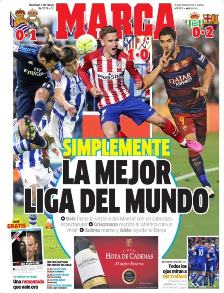 Ahí lo tienen. Repaso general a la jornada de los tres de arriba en las portadas madrileñas. Visión de conjunto, mirada analítica, compendio, trabajo de Wikipedia, labor de contable, acta notarial, ni chicha ni limoná. Marca es muy del gusto de ensalzar lo patrio, así en general, cosa que suele hacer sobre todo cuando les va bien a los clubes españoles en la Europa League. No sabemos si el sentimiento nacional está de capa caída, pero francamente nos suena algo apolillado el debate, si es que lo sigue habiendo, sobre qué liga sea la mejor del mundo. Apolillado y pelín tramposo, ya que habrá que explicitar cuáles son los criterios que se valoran a la hora de optar por una liga y no por otra, cosa que por supuesto no suele hacerse cuando alegremente se dicta sentencia sobre este asunto; sentencia usualmente chovinista, cómo no.