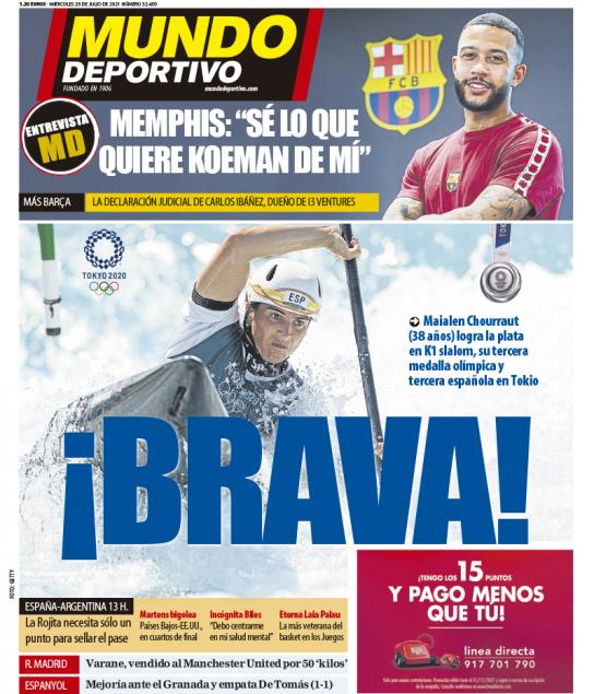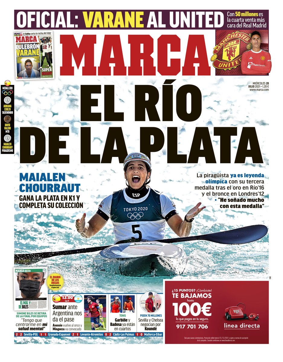 Buenos días. Con los ojos humedecidos por la tristeza y la gratitud, vamos a dar a Raphaël Varane el homenaje que hoy le niegan las portadas del día. Los cuarto jinetes del Apocalipsis optan por dar honores de cinco columnas a Maialen Chourraut, plata en K1 en los Juegos Olímpicos de Tokio.