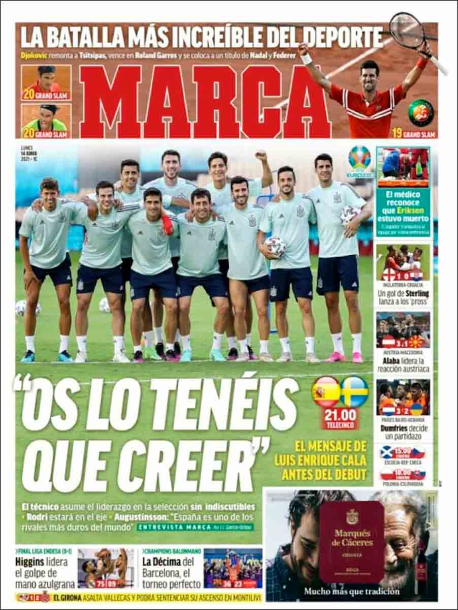 “Os lo tenéis que creer”, titula Marca en referencia al debut de la llamada Roja en la Eurocopa. El evento es a las nueve y lo da la cadena de Jorge Javier Vázquez. El tema es ¿quién exactamente se lo tiene que creer? ¿Quiénes son los señores de la foto? No penséis que no hemos hecho los deberes y no vemos el suficiente fútbol como para reconocerlos, pero confesaremos, ahora que nadie nos lee, que nos falla el que está entre Azpilicueta y el que está a la izquierda del que está a la izquierda de Azpilicueta. Suerte para todos en cualquier caso, también para ese, no tenemos nada contra él. Ni contra el que está a su derecha.