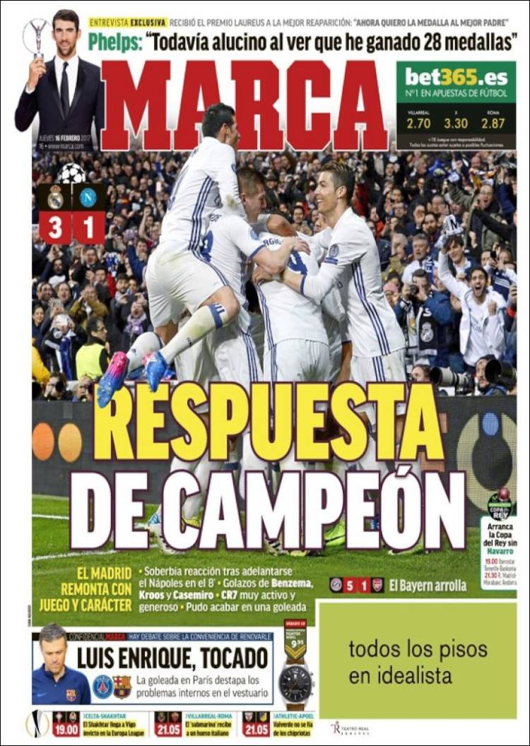 Buenos días, amigos. El Real Madrid selló anoche un marcador de ida en su eliminatoria ante el Nápoles que todos habríamos firmado tranquilamente antes de jugar y entusiásticamente cuando el Nápoles se adelantó. Lo seguimos firmando, si bien con un gusto amargo, al término del partido y a la luz de las múltiples ocasiones falladas por los nuestros, oportunidades que - de haberse materializado- habrían dejado los Octavos vistos para sentencia. Es una verdadera lástima que dentro de quince días debamos introducirnos en el infierno napolitano con un zumbido de intranquilidad en los oídos cuando muy bien podríamos presentarnos allí con todo decidido.