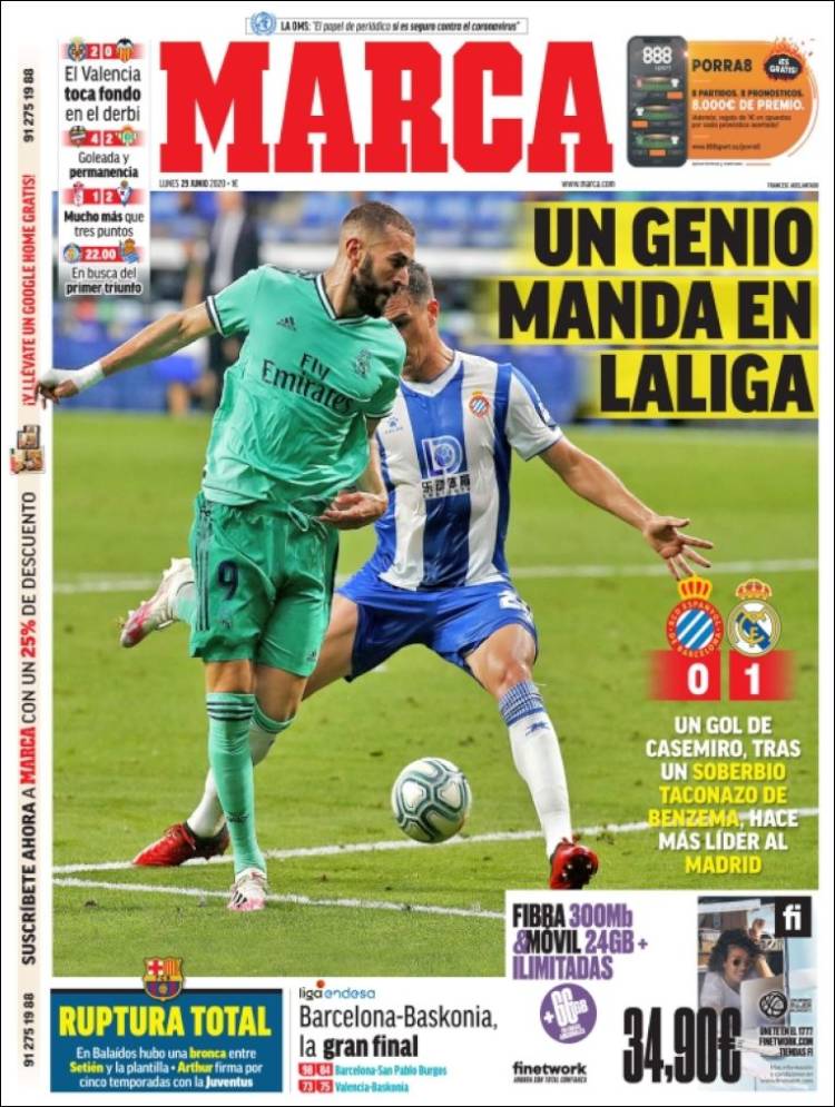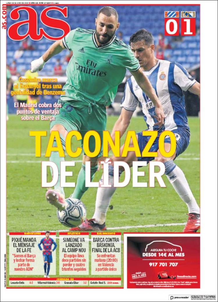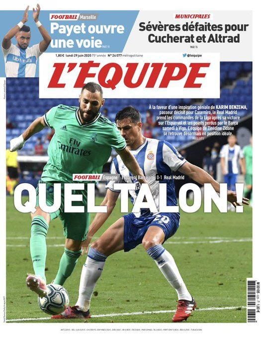 Solemos circunscribir nuestro análisis a las cuatro portadas del periodismo deportivo patrio, pero la ocasión bien merece hoy un enfoque internacional. El diario más importante del país de nacionalidad de Karim (que es además el diario deportivo más importante del planeta) trae la hazaña técnica y poética de Karim a lo más alto de su primera plana. Es una especie de pírrica compensación por el crimen de estado que supone para Francia la tan proverbial como injustificada ausencia en su equipo nacional de este genio absoluto del balompié. El talón. El tacón. “El tacón De Dios”, tituló de manera legendaria Marca al día siguiente de aquel otro taconazo de Guti en Riazor que culminaría en gol (precisamente) Benzema. El tacón de Alá, quizá convenga titular ahora que Benzema le ha devuelto a Guti el taconazo bajo el usufructo de Casemiro. Casemiro, qué partido. Casemiro, qué jugador. Pero esa es otra historia.