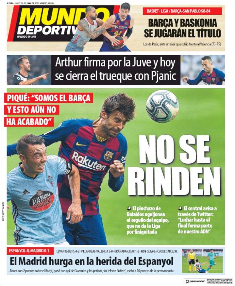 Ya veis. “No se rinden”, titula Mundo Deportivo, en referencia a un nuevo trino por parte de Piqué en el que proclama que “luchar hasta el final forma parte del ADN del Barça”. Nos preguntamos en qué equipo lleva dos décadas jugando Piqué. Ni siquiera en las épocas de mejor fútbol culé se ha distinguido el Barça por su fortaleza anímica, su resistencia a la derrota o su capacidad de remontada. La única remontada reseñable de la historia del Barça la protagonizó un árbitro alemán, con que ya nos dirán. Tenéis otras virtudes, querido Gerard. Alardear de vuestro espíritu indomable sería como hacerlo de vuestra honestidad sobre el césped.