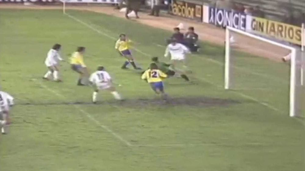 El Madrid ya tenía asegurado el pase a cuartos y el partido moría lentamente. Entonces Míchel cuelga un balón desde la derecha y Juanito y Pardeza luchan por él contra los defensores amarillos. Hugo Sánchez se encuentra en disposición de disparar y su remate golpea en la mano de Linares, que está a punto de descubrir que hay algo peor para un defensa que pitarle un penalti. El balón va a parar a Butragueño, prácticamente parado, que sale corriendo como si acabara de picarle una avispa. Antes, toque de trilero con la izquierda y caño a Linares con la derecha: ya era tarde para pedirle al árbitro que pitara el penalti.