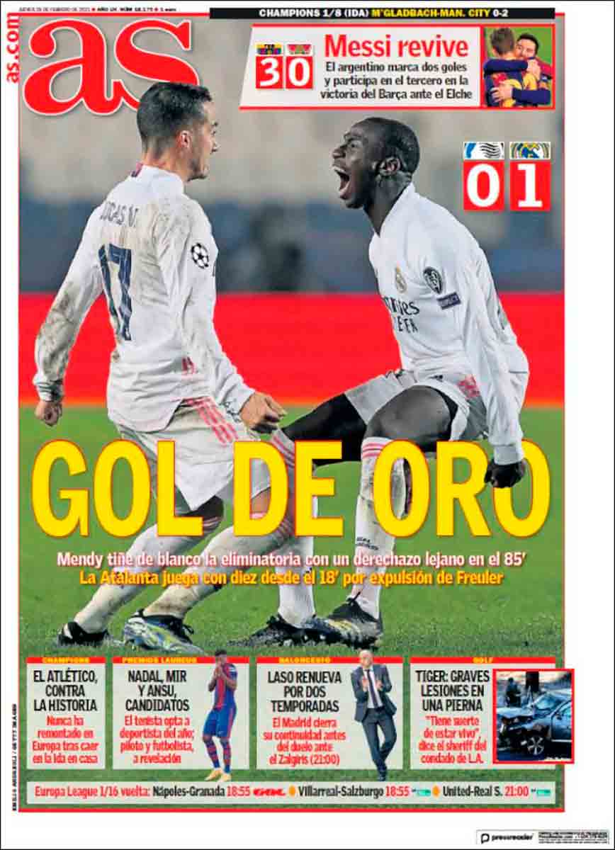 Buenos días. ¿Te acuerdas de aquel gol de Mendy en Bérgamo? Los italianos iban de azul y negro, y tú ibas de gris. La Atalanta, qué gran título para un clásico del romanticismo. Te dije que te quería pero tú sólo tenías ojos para esa sonrisa restallante en la negrura, para la jugada de estrategia que salió primorosamente sin haber salido bien, para la resurrección absolutamente inopinada de Isco, para la solidez inquebrantable de Nacho, para la lucha indesmayable de todos, los que jugaron bien y los que no pero lo intentaron.