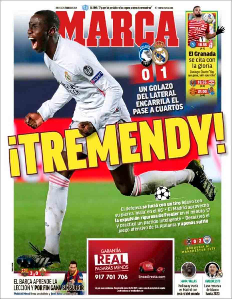 “¡Tremendy!” no es en cambio un buen título para un clásico del cine romántico, pero bueno, qué más da. Al menos hay un énfasis, un afán de posteridad en ese juego de palabras algo chusco pero muy admisible en realidad. Hay en lo de “¡Tremendy!” un afán de que la portada sea recordada junto a la noche, y nos parece hasta bien a ti y a mí porque ello trae consigo la idea implícita de que la noche merece ser recordada. No era eso lo que parecían opinar las radios y televisiones postpartido, platós inquisidores preguntando a los jugadores y el técnico del único equipo español capaz de ganar su partido de Champions por todo (?) lo que había salido mal. Que si no jugamos bien, que si falta gol. Vayan ustedes, con todo el respeto, muy tranquilamente en viaje relámpago al carajo, con billete de ida y vuelta para que no lo tomen a mal, dijiste entre risas y entre sábanas. Hicimos el amor y te noté distante, acaso porque pensabas en Maldini diciendo que lo de ayer no era expulsión pero lo de Militao sí. “Hay que joderse”, musitaste entre dientes en medio de la coyunda, pero no me turbó: sabía a qué te referías.