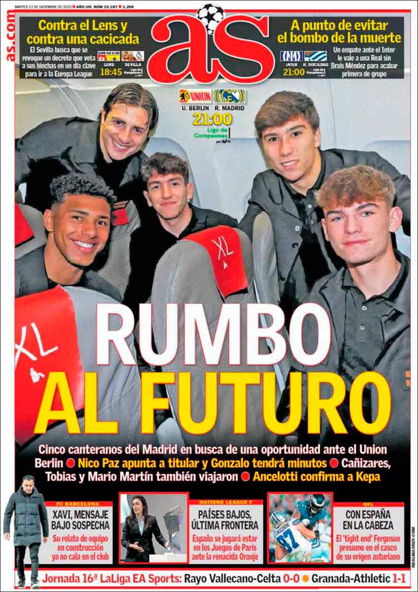 Ayer, los de Ancelotti pusieron rumbo a Berlín ataviados con sus trajes feos de operarios de calderas. Debido a la singladura inmaculada de los merengues en Champions, la expedición está trufada de jóvenes talentos rumbo al futuro, como destaca As.