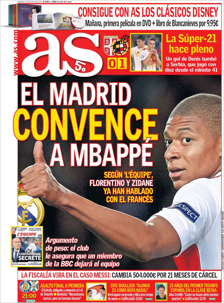 Decíamos que un agradecimiento que de verdad lo es tiene vocación de completud, así que no vamos a añadir a él -no vamos a añadir a este portanálisis- más motivos que se salgan del principal y que contribuyan a opacarlo. Así que, como manda la sección, vaya el resto de portadas del día, pero esta vez sin mayor comentario. Cerremos con la portada de L'Equipe que vende hoy el As, con el cumpleaños de Messi con un juego de ollas como regalo, y con la casi presentación en azulgrana de Verratti en una gala que conduce Julio Sabala, trasunto hoy del hijo del padre de Neymar Jr. que aparece en la portada de Sport.