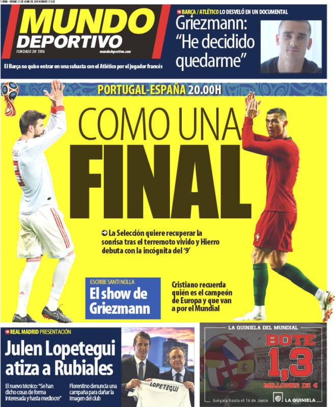 Buenos días. Ayer intuíamos que el protagonista del día iba a ser, una vez más, Lopetegui, pero nos equivocamos. Efectivamente, el nuevo entrenador del Real Madrid fue uno de los nombres propios de la jornada, aunque no el único. Griezmann, que decidió quedarse en el Atlético de Madrid para ridículo mundial del Barcelona y la prensa cataculé, haciéndolo además en el transcurso de un documental facturado por una empresa de Piqué (!), hicieron sombra a Lopetegui en el día de su presentación.